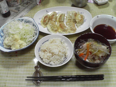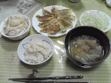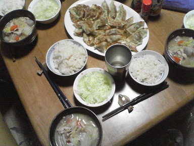 今日は餃子などを頂きます。普通の餃子?味噌汁は豚汁風、キャベツサラダも頂きます。今日もおいしく頂きました。