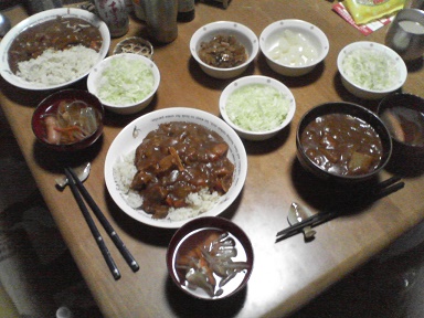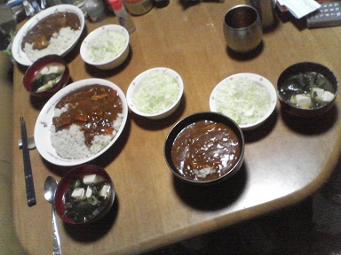 今日はカレーなどを頂きます。普通のポークカレー?こちらは丼カレー?カレー丼?味噌汁は豆腐とワカメ、キャベツサラダも頂きます。今日もおいしく頂きました。
