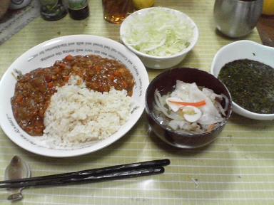 今日はカレーなどを頂きます。キーマカレーらしきもの?メカブも頂きます。ミックス野菜とワンタンのスープ、キャベツサラダも頂きます。今日もおいしく頂きました。