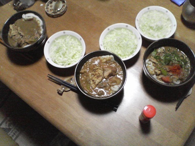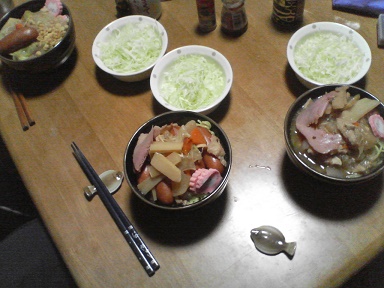 今日はラーメンなどを頂きます。前回の豚汁をアレンジ、味噌ラーメン風?キャベツサラダも頂きます。今日もおいしく頂きました。
