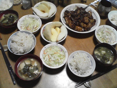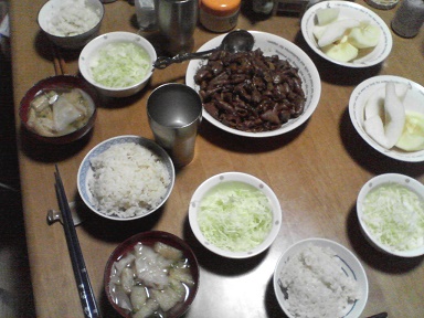 今日は豚ホルモンなどを頂きます。豚ホルモンと玉葱などを炒め、焼き肉のタレで味付けしたもの、ワンタンスープ、都合によりあぶらげ入り?キャベツサラダも頂きます。デザート?リンゴとナシ・・今日もおいしく頂きました。