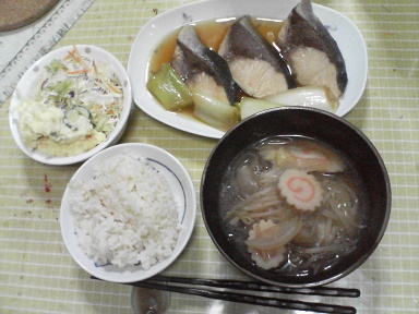 今日はブリなどを頂きます。ブリの煮物・・汁物は野菜スープ、サラダも頂きます。今日もおいしく頂きました。