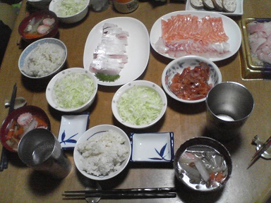 今日は刺身などを頂きます。正月用の刺身らしきもの?汁物は雑煮風?チーズのおつまみ・・キャベツサラダも頂きます。今日もおいしく頂きました。