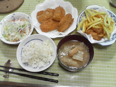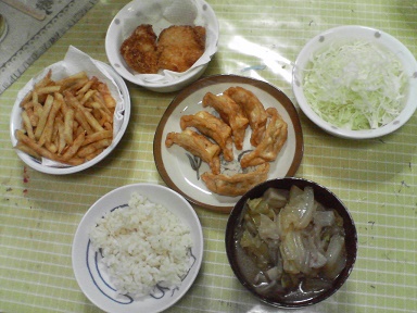 今日は揚物などを頂きます。冷凍物のイカフライ、ポテトフライ、味噌汁は白菜とあぶらげ、キャベツサラダも頂きます。今日もおいしく頂きました。