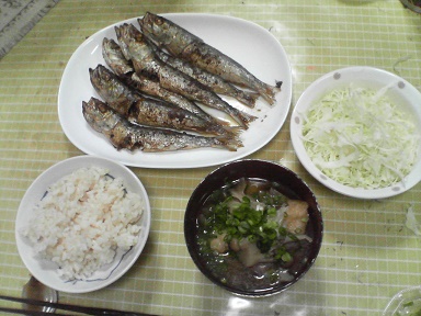 今日はイワシなどを頂きます。オリーブ油で焼いた丸干しイワシ、味噌汁はシメジと舞茸とあぶらげ、キャベツサラダも頂きます。今日もおいしく頂きました。