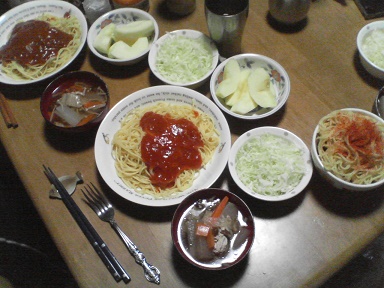 今日はパスタなどを頂きます。とりあえずミートソース?ペペロンチーノとは違うみたい・・激辛風?汁物は前回の汁を流用、キャベツサラダも頂きます。リンゴも・・今日もおいしく頂きました。