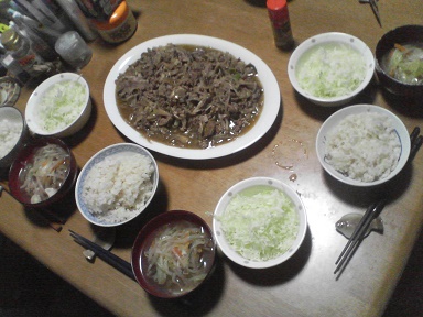 今日は豚肉などを頂きます。豚肉とモヤシなどを炒め、醤油タレで味付けしたもの、汁物は前回のスープを流用・・キャベツサラダも頂きます。今日もおいしく頂きました。