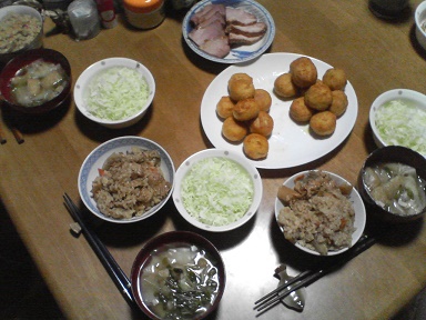今日は揚物などを頂きます。鶏肉の揚物とチーズ入りの揚物?ハムもいT抱きます。炊き込み御飯・・前回のワンタンスープを流用、キャベツサラダも頂きます。今日もおいしく頂きました。