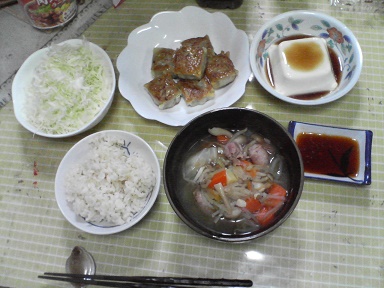 今日は豚肉などを頂きます。豚肉の塩コショー焼き、豆腐のチーズ掛け?味噌汁は前回の野菜汁のアレンジ版・・サラダも頂きます。今日もおいしく頂きました。