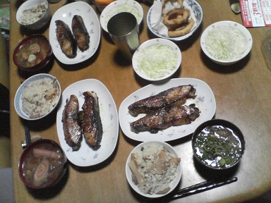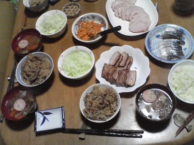 今日は炊き込み御飯などを頂きます。炊き込み御飯の素と焼き鳥の鶏皮や舞茸などを追加して炊いたもの・・おかずにハムなどを頂きます。〆鯖も・・うにイカも頂きます。汁物は前回からの雑煮もどきの流用、キャベツサラダも頂きます。今日もおいしく頂きました。