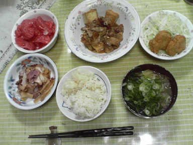 今日は豚肉などを頂きます。豚肉と揚げ豆腐の煮物・・ベーコンとメンマのおつまみ?汁物は前回のスープを流用、ネギトッピング・・キャベツサラダも頂きます。なぜか蒲鉾のトッピング?グレープフルーツも・・今日もおいしく頂きました。