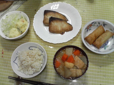 今日はブリなどを頂きます。ブリの塩焼き・・春巻も頂きます。味噌汁は大根とニンジンなどとあぶらげ、サラダも頂きます。今日もおいしく頂きました。