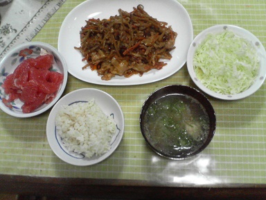 今日は豚肉とゴボウの炒め物などを頂きます。市販の豚肉とゴボウなどのタレ漬けを炒めたもの、鶏団子とモヤシなどのスープ、キャベツサラダも頂きます。グレープフルーツも・・今日もおいしく頂きました。