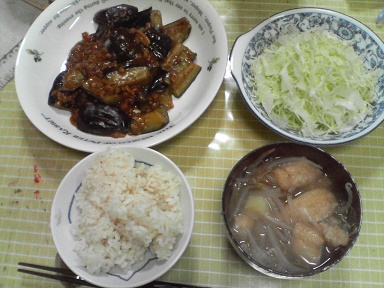 今日は麻婆茄子などを頂きます。市販の素で作った麻婆茄子、味噌汁はモヤシとあぶらげ、キャベツサラダも頂きます。今日もおいしく頂きました。