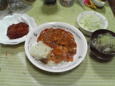 今日はハヤシライスなどを頂きます。普通のハヤシライス?鶏肉の揚物も頂きます。味噌汁はキャベツとシメジ、キャベツサラダも頂きます。今日もおいしく頂きました。