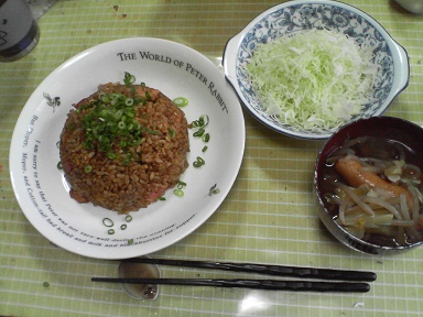 今日は炒飯などを頂きます。市販の素で炒めた色の濃い炒飯?汁物は前回の野菜スープを流用、キャベツサラダも頂きます。今日もおいしく頂きました。