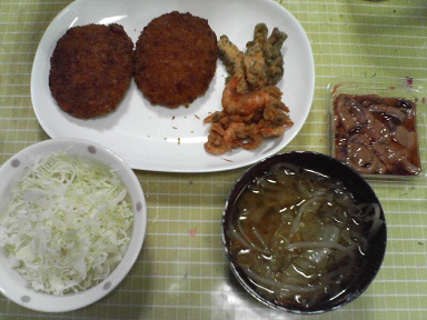 今日は揚物などを頂きます。エビカツとイカフライ、小エビの揚物など、イカの塩辛も頂きます。ミックス野菜の味噌汁・・キャベツサラダも頂きます。今日もおいしく頂きました。