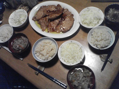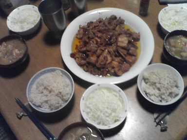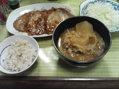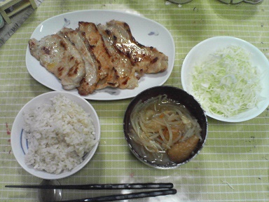 今日は豚肉などを頂きます。豚肉をオリーブ油で焼いて焼き肉のタレで絡めたもの・・味噌汁はミックス野菜とあぶらげ、キャベツサラダも頂きます。今日もおいしく頂きました。