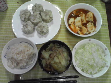 今日は焼売などを頂きます。普通の焼売?麻婆豆腐も頂きます。味噌汁はキャベツとシメジとあぶらげ、キャベツサラダも頂きます。今日もおいしく頂きました。