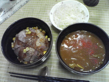 今日はハヤシライスなどを頂きます。ハヤシ丼?汁物は前回の豚挽肉スープを流用、キャベツサラダも頂きます。今日もおいしく頂きました。