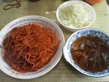 今日はパスタなどを頂きます。ナポリタンらしきもの?ミックス野菜のスープ、キャベツサラダも頂きます。今日もおいしく頂きました。