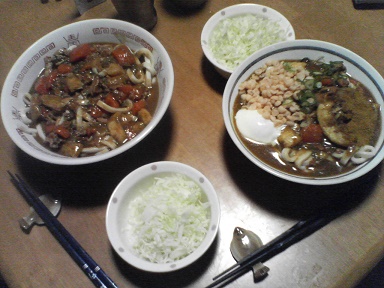 今日はカレーうどんなどを頂きます。温めたうどんに前回のカレーをかけて頂きます。好みで色々トッピング・・キャベツサラダも頂きます。今日もおいしく頂きました。