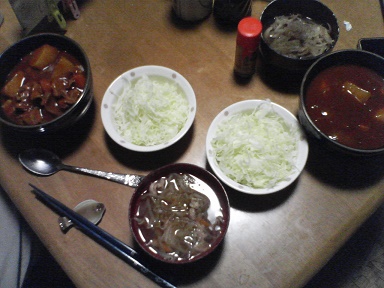 今日は餃子と焼売などを頂きます。普通の餃子と焼売・・鶏肉も頂きます。汁物は前回の汁のアレンジ品、キャベツサラダも頂きます。今日もおいしく頂きました。