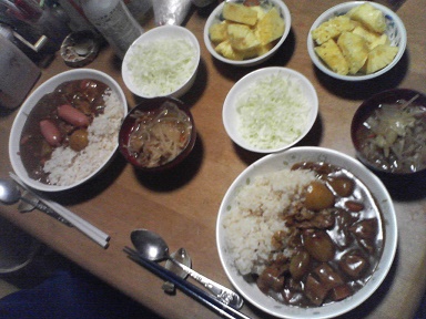 今日はカレーなどを頂きます。ポークカレー・・こちらばソーセージをトッピング、味噌汁はミックス野菜とあぶらげ、キャベツサラダも頂きます。パイナップルも・・今日もおいしく頂きました。