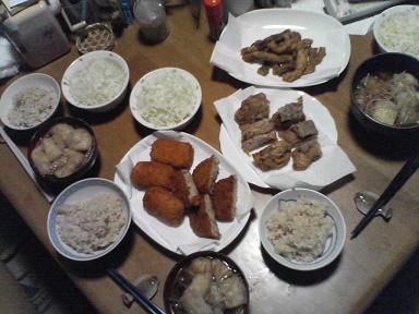 今日は揚物などを頂きます。コロッケ、鶏肉、イカなど・・味噌汁はミックス野菜とあぶらげ、キャベツサラダも頂きます。今日もおいしく頂きました。