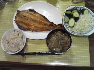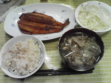 今日はホッケなどを頂きます。ホッケの開き・・鶏皮とミックス野菜のスープ、キャベツサラダも頂きます。今日もおいしく頂きました。