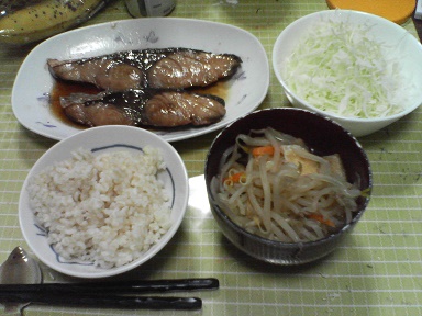 今日はブリなどを頂きます。ブリの照り煮?味噌汁はミックス野菜とあぶらげ、キャベツサラダも頂きます。今日もおいしく頂きました。