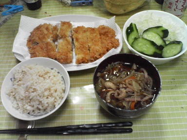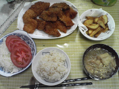 今日はカツなどを頂きます。トンカツらしきもの?ポテトも頂きます。味噌汁はモヤシと卵とあぶらげ、サラダも頂きます。今日もおいしく頂きました。