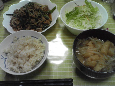 今日はニラ炒めなどを頂きます。豚挽肉とニラとモヤシを炒め、市販の素で味付けしたもの・・味噌汁はモヤシとあぶらげ、サラダも頂きます。今日もおいしく頂きました。