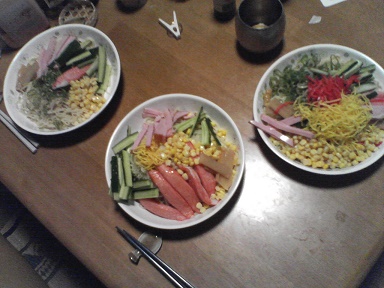 今日は冷やし中華などを頂きます。あり合わせの具材をトッピング・・今日もおいしく頂きました。