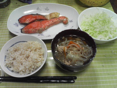 今日はシャケなどを頂きます。オリーブ油で焼いた甘塩のシャケ、豚挽肉とミックス野菜のスープ、キャベツサラダも頂きます。今日もおいしく頂きました。