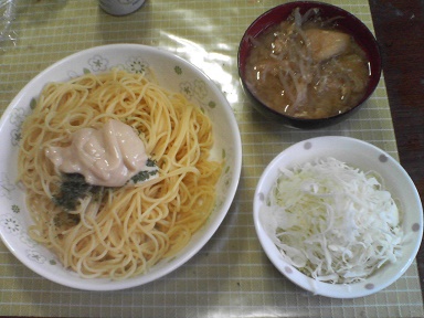 今日はパスタなどを頂きます。クリームパスタ?味噌汁は前回のモヤシとあぶらげの汁を流用、キャベツサラダも頂きます。今日もおいしく頂きました。