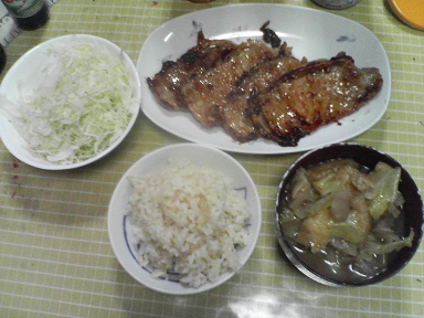 今日は豚肉などを頂きます。豚肉の味噌漬け・・味噌汁はキャベツとあぶらげ、キャベツサラダも頂きます。今日もおいしく頂きました。
