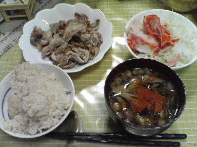 今日は豚肉などを頂きます。オリーブ油で焼いた豚肉、茄子とあぶらげの味噌汁・・サラダも頂きます。今日もおいしく頂きました。