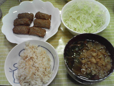 今日はミニハンバーグなどを頂きます。ミニハンバーグ、お弁当用らしい・・汁物は前回の鶏皮スープのアレンジ品、キャベツサラダも頂きます。今日もおいしく頂きました。