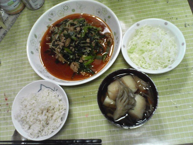 今日はニラ炒めなどを頂きます。豚挽肉とニラとモヤシを市販の素で炒めたもの・・ワカメとミックス野菜のスープ、キャベツサラダも頂きます。今日もおいしく頂きました。