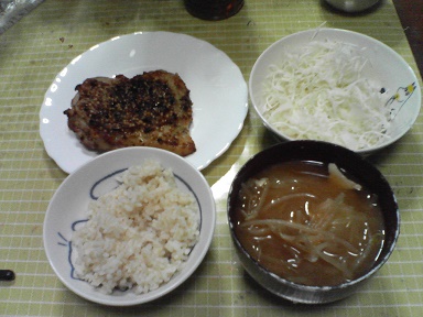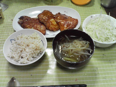 今日は鶏肉などを頂きます。市販の味付け鶏肉を焼いたもの・・味噌汁はミックス野菜とあぶらげキャベツサラダも頂きます。今日もおいしく頂きました。