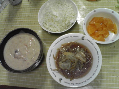 今日は酢豚などを頂きます。豚肉、ピーマン、玉葱、人参などを炒め、市販の素で味付けしたもの、汁物は前回のスープのアレンジ品、キャベツサラダも頂きます。今日もおいしく頂きました。