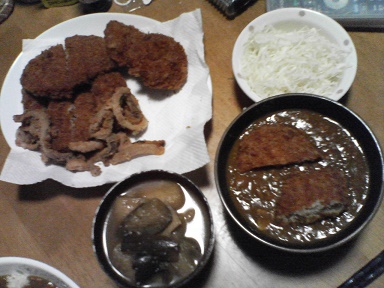 今日はメンチカツカレーなどを頂きます。前回のカレーを流用、メンチカツをトッピング・・揚物も頂きます。味噌汁は前回の茄子汁を流用・・キャベツサラダも頂きます。今日もおいしく頂きました。