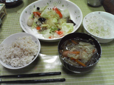 今日は八宝菜などを頂きます。市販の素で作った八宝菜?汁物は前回のスープを流用・・キャベツサラダも頂きます。今日もおいしく頂きました。