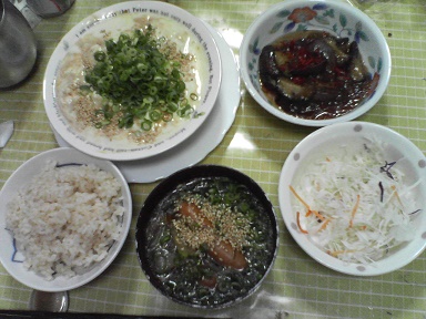 今日は茄子炒めなどを頂きます。市販の素で作った茄子炒め、豆腐も頂きます。汁物は前回のスープのアレンジ品、キャベツサラダも頂きます。今日もおいしく頂きました。