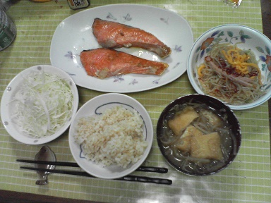今日はシャケなどを頂きます。オリーブ油で焼いた甘塩のシャケ、中華春雨も頂きます。味噌汁はモヤシとあぶらげ、キャベツサラダも頂きます。今日もおいしく頂きました。