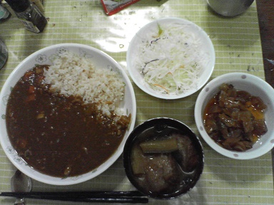 今日はカレーなどを頂きます。普通のポークカレー?定番の福神漬・・味噌汁は茄子と油麩、キャベツサラダも頂きます。今日もおいしく頂きました。