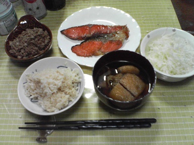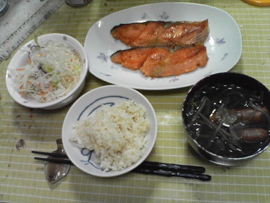 今日もシャケなどを頂きます。オリーブ油で焼いたシャケ、汁物はミックス野菜とあぶらげ、キャベツサラダも頂きます。今日もおいしく頂きました。