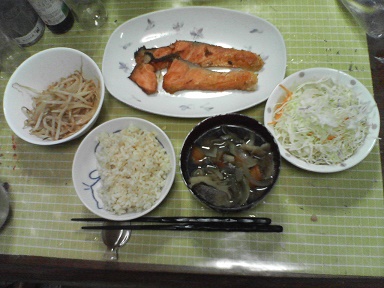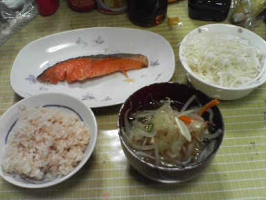 今日はシャケなどを頂きます。オリーブ油で焼いた甘塩のシャケ、汁物はモヤシとソーセージのスープ、黒ゴマを入れたら黒っぽい色に・・キャベツサラダも頂きます。今日もおいしく頂きました。