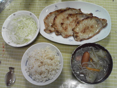 今日は豚肉などを頂きます。普通の豚肉?汁物はミックス野菜とソーセージのスープ、キャベツサラダも頂きます。今日もおいしく頂きました。